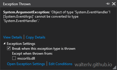 在委托中,即便签名完全相同,也不是同一个委托类型。如果传入的参数类型改为 EventHandler<EventArgs> ,或者 BlogPublished 事件的类型改为 EventHandler<EventHandler>,虽然实际上这两个委托的签名是兼容的,但其委托类型不同,依然是不能互相转换的。你会在运行时遇到一下异常: